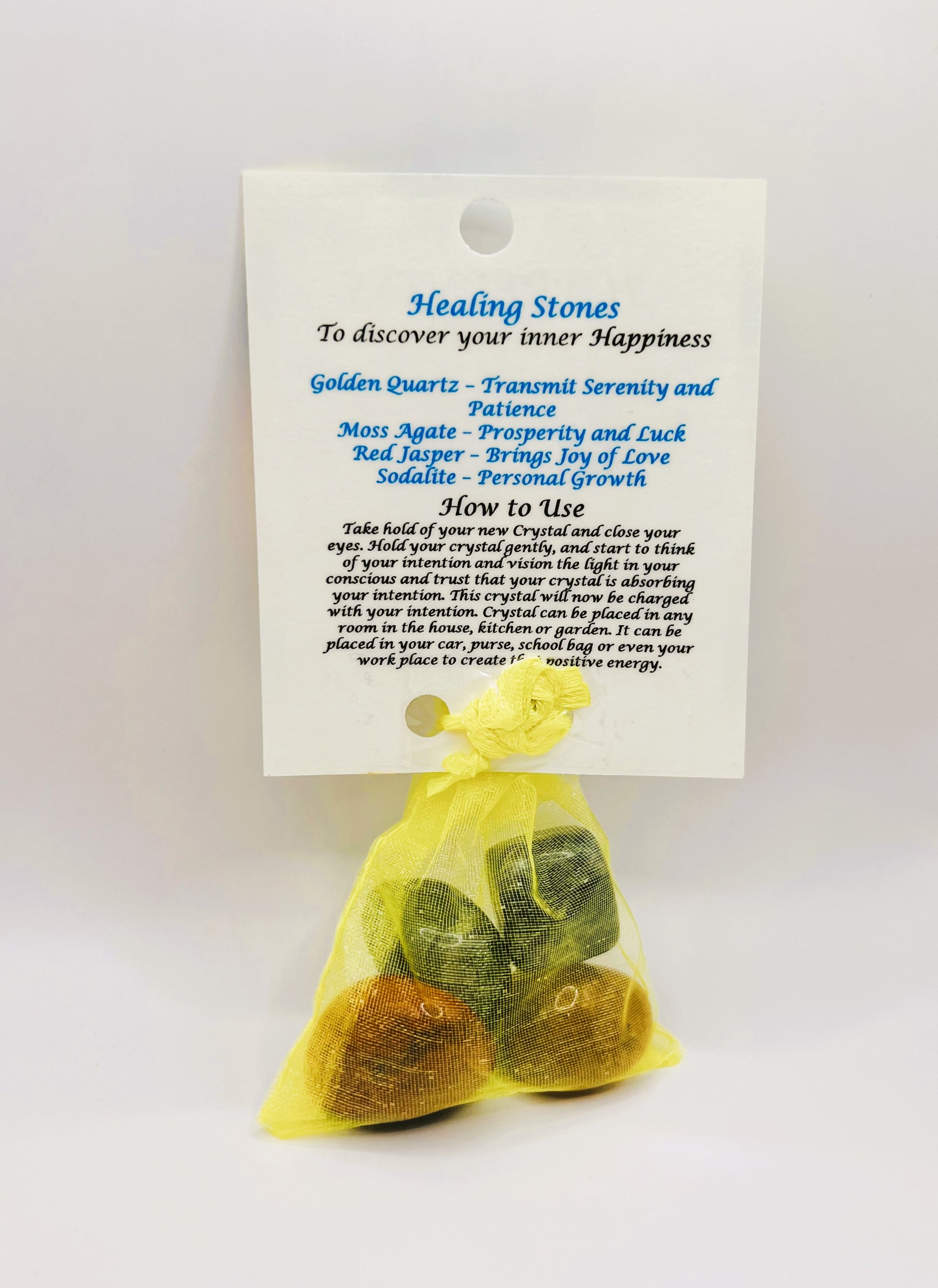 Happiness crystal healing bag has Golden Quartz, Moss Agate, Sodalite and Red Jasper to bring inner joy, peace of mind and optimism as well as feelings of exhilaration, playfulness, good spirits and laughter.