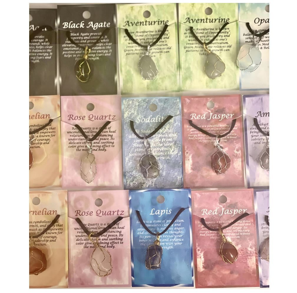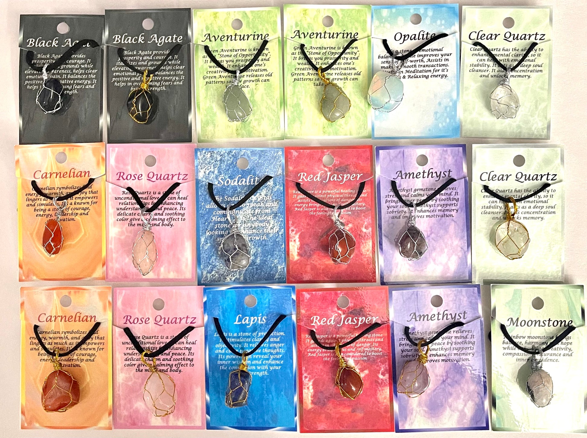 Handmade Wire Wrapped Natural Gemstone Necklace. Case of 36 Necklace with a Mix of Amethyst, Rose Quartz, Red Jasper, Carnelian, Green Aventurine, Opalite, Lapis, Sodalite, Rainbow Moonstone Gemstone in Golden and Silver Wire.