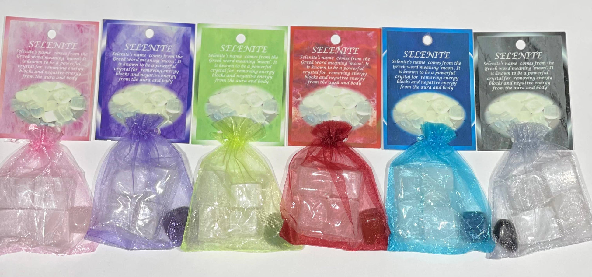This is a set of 6 Selenite bags, each bag comes with 4 pieces of big size Selenite Tumbled and a gemstone in it (Rose Quartz, Sodalite, Amethyst, Red Jasper, Green Aventurine, Black Agate)
